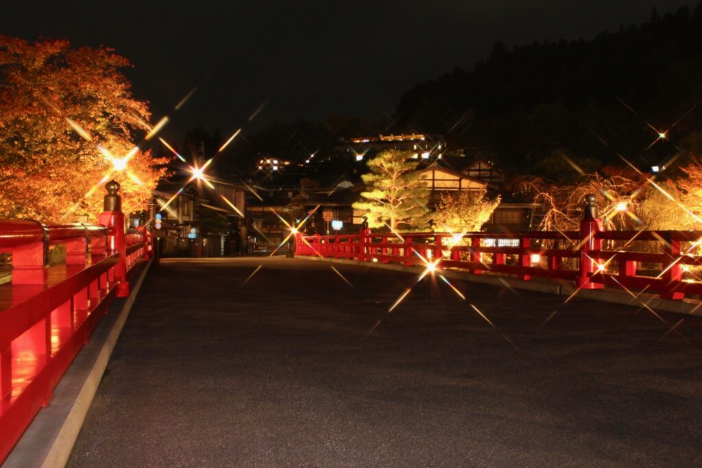 秋の紅葉シーズンには夜間ライトアップが行われ、赤い欄干と周囲の木々が水面に映り込む姿は幻想的そのもの。