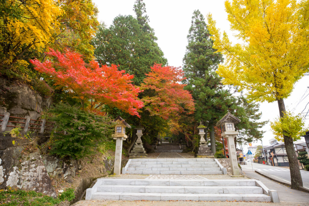 「古い町並」から徒歩5分ほど、城山のふもとに鎮座する日枝神社。秋になると参道を彩るモミジが赤く燃え立ち、やがてイチョウが黄金色に輝きます。