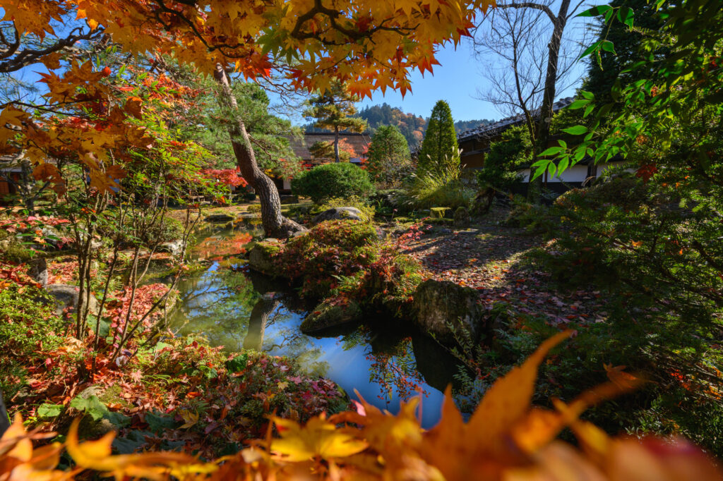 途中にある川上別邸史跡公園の庭園も隠れた名所。紅葉だけでなく、飛騨の歴史を深く味わえるスポットです。