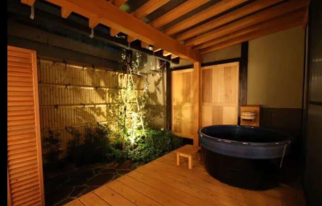 築145年を経た古民家の落ち着いた佇まいの中で、訪れる人を迎えるのは、檜の壁に囲まれた半露天風呂です。