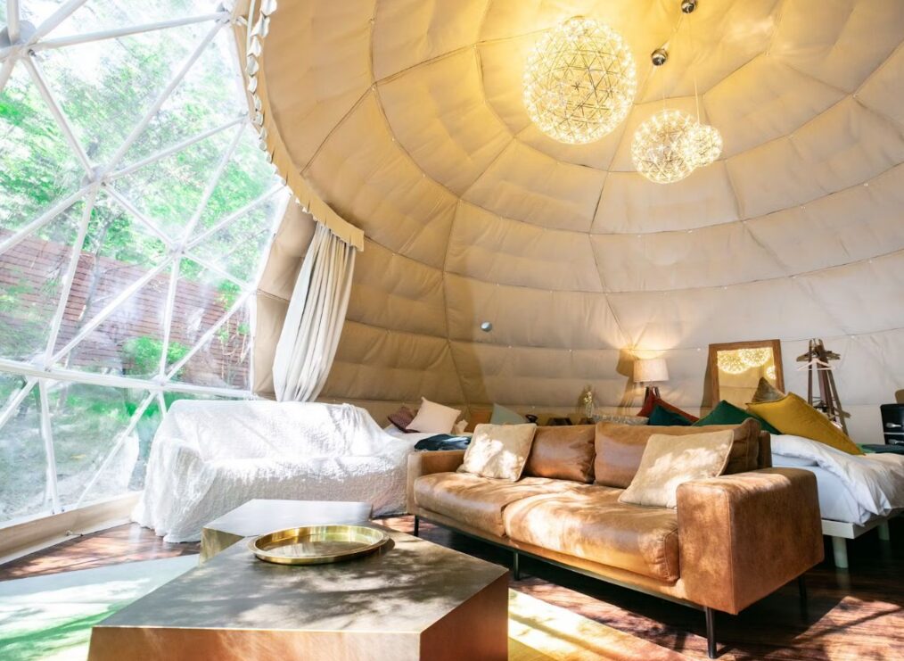ここでは、都会の喧騒や日常の慌ただしさから切り離され、自然と調和した静けさに包まれるひとときを過ごせます。1日わずか4組限定の贅沢な空間は、誰にも邪魔されない“自分たちだけの森”そのもの。ドーム型テントには半露天風呂やオープンテラスが備わり、昼は緑に揺れる木々を眺め、夜は満天の星に見守られながらゆったりと過ごせます。
