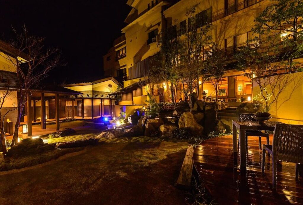 夜の露天風呂は、灯りが湯面に反射して幻想的な雰囲気を演出。時間がゆっくりと流れる、贅沢なひとときを味わえます。