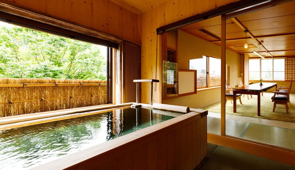 和と洋を兼ね備えた「宵待草の間」では、半露天風呂から茅葺き屋根の合掌村が望めます。