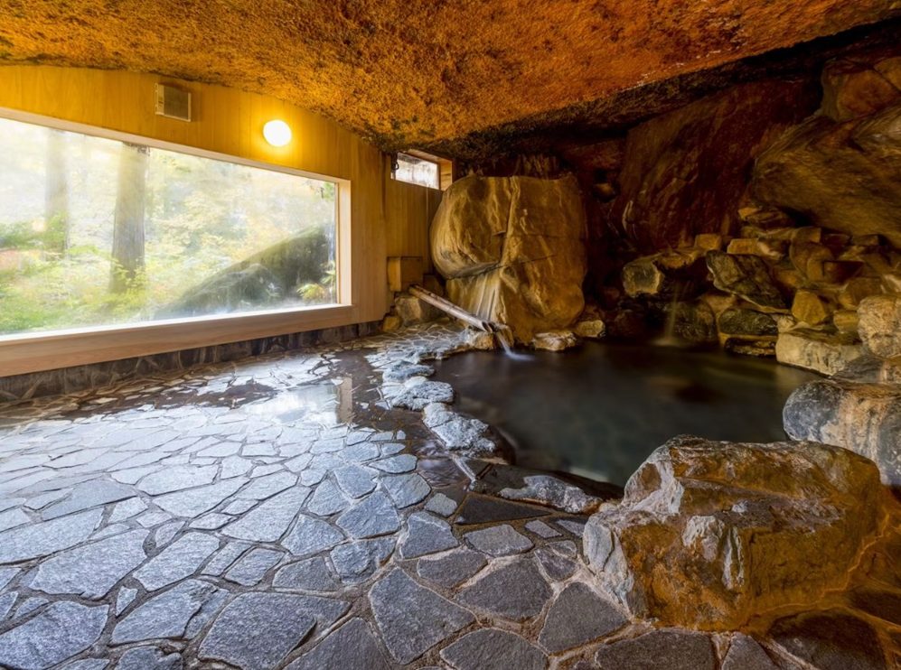 1階にある内風呂「石橋の湯」は、広々とした湯殿と大きなガラス窓が特徴です。手足を伸ばしてゆったりと浸かりながら、外の景色を楽しむ贅沢な時間を過ごせます。開放感あふれるこの湯処で、心行くまで温泉を堪能してください。