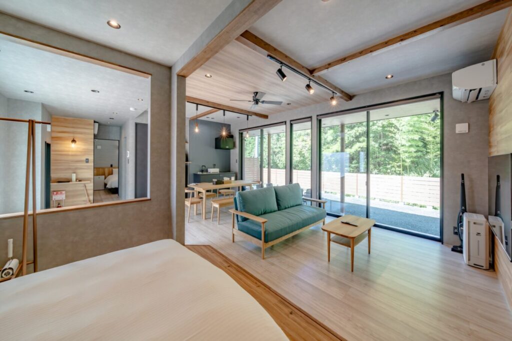 「WAT RESORT いぬとサウナ BBQ&ドッグラン ヴィラ 高山」の客室は、愛犬との滞在に最適化された贅沢なヴィラタイプ。