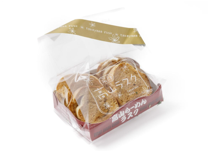 飛騨高山名物の醤油ラーメンを再現したユニークなラスク。サクサクの食感とネギの香ばしさがクセになります。